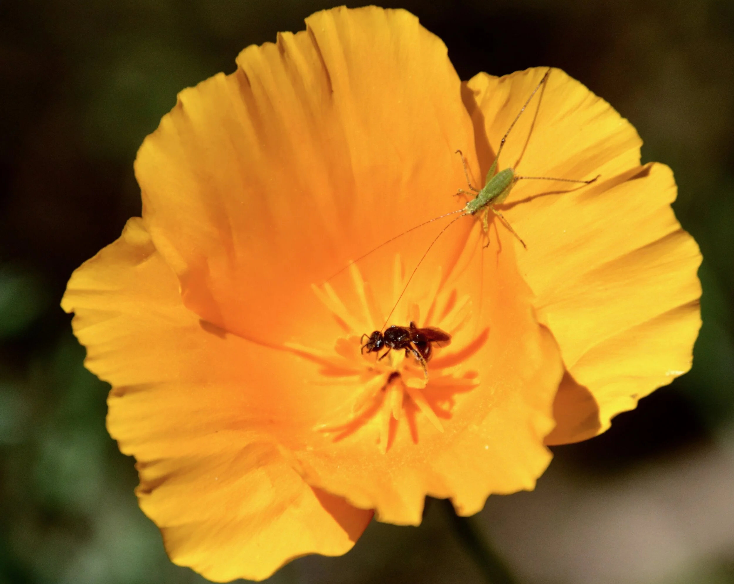 There seemed ample room on this single poppy as two bugs landed side-by-side to check it out. I don’t know enough about insects to guess whether they were even looking for the same thing from these delicate petals waving in the wind, but peace was, thankfully, maintained.