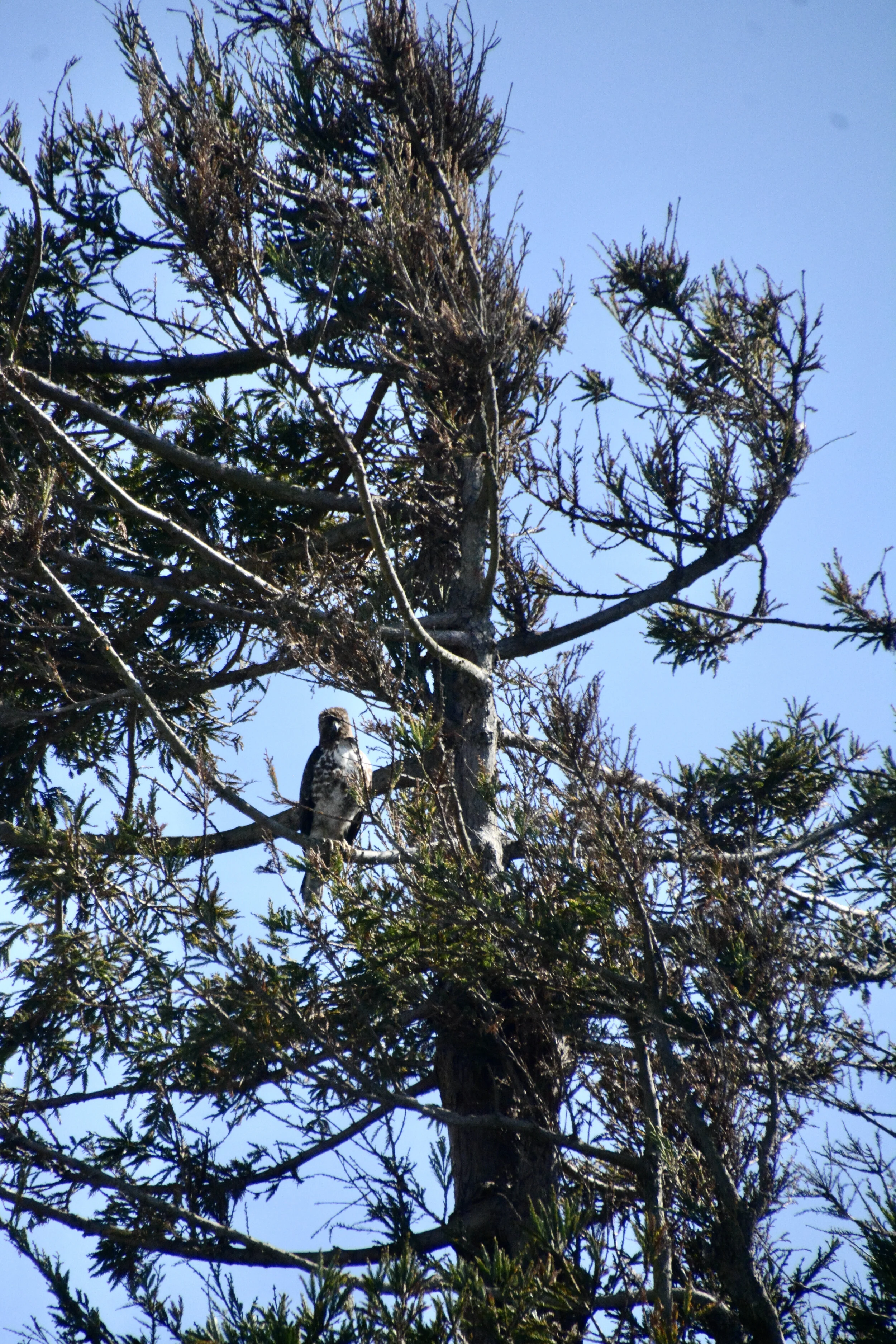 We first became acquainted with this red tailed hawk when, as a juvenile, he flew head-on into our garage door years ago, before I moved out here full time. Thankfully, the bird recovered, and now full-grown, he sometimes sits high atop the redwood tree in the far corner of what is now my block, my home. From some 60’ up, the hawk must have a splendid view of nearly the entire city and across the bay to Oakland. With his keen eyesight, too, he surely tracks the cats, moles, mice, and squirrels below him. Yesterday, accompanied and unperturbed by a flank of scolding crows, the hawk soared to his perch and stayed there as we entertained a vaccinated visitor out on the deck.